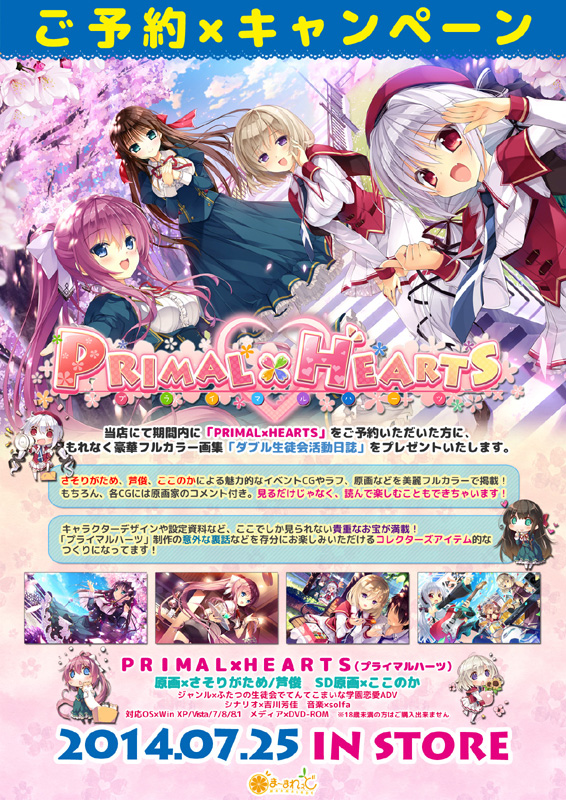 PRIMAL×HEARTS 初回限定版 Getchuで見る ブランド:ま~まれぇど(過去の作品一覧) メディア:DVD-ROM 発売日:2014-08-29 定価:¥ 8,800(税込¥ 9,680) ジャンル:ふたつの生徒会でてんてこまいな学園恋愛ADV 原画: さそりがため、芦俊、ここのか(SD原画) シナリオ: 吉川芳佳 音楽: アーティスト:solfa feat.Ceui 作詞/作曲:天ヶ咲麗/橘咲透 関連リンク Getchu.com:あらすじ、キャラクターを見る 初回限定版特典 乳袋OPENパッチROM キャンペーン詳細は公式HPでご確認ください 予約キャンペーン 豪華フルカラー画集「ダブル生徒会活動日誌」 ~ 早期予約キャンペーン さそりがため先生描き下ろし特製色紙 ~ 特典紹介画像URLについて 描き下ろし特典 投票数:976 ソフマップ ① 描き下ろし抱き枕カバー② 描き下ろしB5下敷き③ 録り下ろしドラマCD ③ 出動月華会! どきどきハニートラップ入門 2014-06-17 更新 © ま~まれぇど 投票数:542 メディオ ① 描き下ろしテレカ② 録り下ろしドラマCD ② 聖良ちゃん、秘密の隠し味 2014-06-19 更新 © ま~まれぇど 投票数:501 Getchu.com ① 描き下ろしB2タペストリー② 録り下ろしドラマCD ② 歌奈先輩とエッチなバニーさん 2014-06-18 更新 © ま~まれぇど 投票数:311 ゲーマーズ ① 描き下ろしB2タペストリー ・ 2014-05-20 更新 © ま~まれぇど 投票数:235 トレーダー ① 描き下ろし両面抱き枕カバー ・ 2014-05-16 更新 © ま~まれぇど 投票数:193 グッドウィル ① 描き下ろしB2タペストリー ・ 2014-05-20 更新 © ま~まれぇど 投票数:123 メロンブックス ① 描き下ろしB2タペストリー ・ 2014-05-16 更新 © ま~まれぇど 投票数:102 よろずやショップびっく宝島 ① 描き下ろしテレカ ・ 2014-05-17 更新 © ま~まれぇど 投票数:95 コムロード ① 描き下ろしB2タペストリー ・ 2014-05-20 更新 © ま~まれぇど オフィシャル通販 投票数:283 オフィシャル通販 ① 描き下ろしB2タペストリー ・ 2014-07-29 更新 © ま~まれぇど オリジナル特典 投票数:143 VISCO ① オリジナルテレカ ・ 2014-07-02 更新 © ま~まれぇど 投票数:59 おた★CHU.com ① オリジナルテレカ ・ 2014-07-11 更新 © ま~まれぇど 投票数:41 アリスNET ① オリジナルテレカ ・ 2014-07-01 更新 © ま~まれぇど 投票数:39 RX-GAME ① オリジナルテレカ ・ 2014-07-04 更新 © ま~まれぇど 投票数:33 ラムタラ ① オリジナル図書カード ・ 2014-07-03 更新 © ま~まれぇど 投票数:30 シーガル ① オリジナルテレカ ・ 2014-07-24 更新 © ま~まれぇど 投票数:27 中京マイコン ① オリジナルテレカ ・ 2014-07-04 更新 © ま~まれぇど 投票数:24 パソコンショップMK ① オリジナルテレカ ・ 2014-07-02 更新 © ま~まれぇど 投票数:24 ファミーズ ① オリジナルテレカ ・ 2014-07-03 更新 © ま~まれぇど 投票数:24 プロップ通販 ① オリジナルテレカ ・ 2014-07-02 更新 © ま~まれぇど 投票数:23 あみあみ ① オリジナルテレカ ・ 2014-07-03 更新 © ま~まれぇど 投票数:3 Amazon.co.jp ① オリジナルポストカード ・ 2014-08-22 更新 © ま~まれぇど << Prev Next >> DLタイトルPowered by FANZA Webサービス バカップル・サプリメントDL価格:¥ 10,780 【スタステ】スタディ§ステディ1+2パックDL価格:¥ 14,980 お家に帰るまでがましまろです【萌えゲーアワード2017 グラフィック賞 受賞】DL価格:¥ 8,352 プライマルハーツ1+2パックDL価格:¥ 7,150 【スタステ】イチャ×2スタディ由乃〜Dear Future〜【萌えゲーアワード2024 ロープライス賞 受賞】DL価格:¥ 2,750 【スタステ】スタディ§ステディ2【萌えゲーアワード2022 グラフィック賞 受賞】DL価格:¥ 10,780 【スタステ】スタディ§ステディDL価格:¥ 8,352 PRIMAL×HEARTS2【萌えゲーアワード2015 エロス系作品賞PINK 受賞】DL価格:¥ 7,945 【スタステ】イチャ×2スタディDL価格:¥ 2,750 星ノ音サンクチュアリDL価格:¥ 7,124