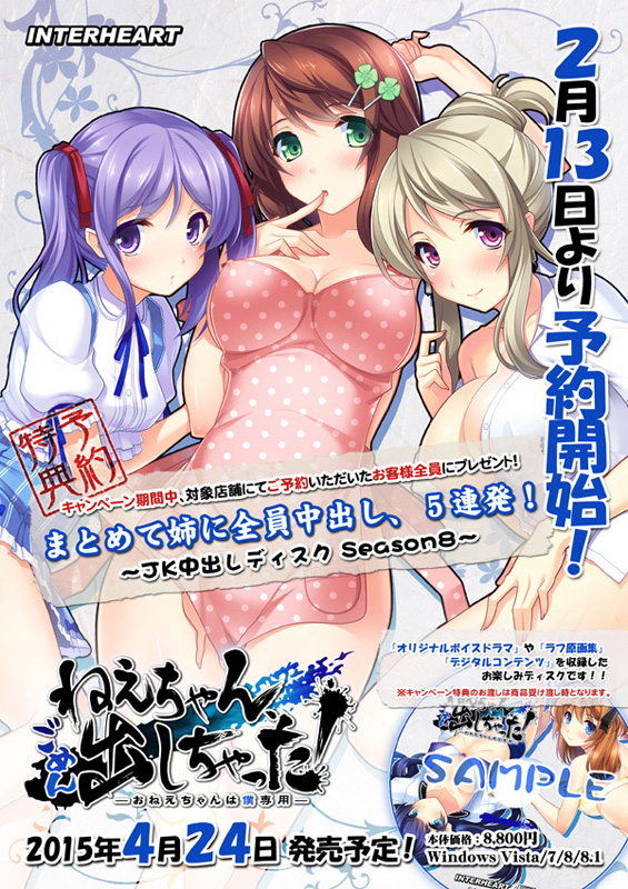 ねえちゃん、パックで出しちゃった! Getchuで見る ブランド:インターハート(過去の作品一覧) メディア:DVD-ROM 発売日:2015-04-30 定価:¥ 9,800(税込¥ 10,780) ジャンル:ADV 原画: 火炎味噌 シナリオ: 十全 音楽: アーティスト: 作詞/作曲: 関連リンク Getchu.com:あらすじ、キャラクターを見る キャンペーン詳細は公式HPでご確認ください 予約キャンペーン JK中出しディスク Season8 ~ 特典紹介画像URLについて 描き下ろし特典 投票数:127 メディオ ① 描き下ろしテレカ ・ 2015-03-31 更新 © INTER HEART 投票数:25 ソフマップ ① 描き下ろしテレカ ・ 2015-03-17 更新 © INTER HEART 投票数:4 とらのあな ① 描き下ろし複製サイン色紙 ・ 2015-03-31 更新 © INTER HEART 投票数:1 Getchu.com ① 描き下ろしテレカ ・ 2015-03-31 更新 © INTER HEART 投票数:0 グッドウィル ① 描き下ろしA3タペストリー ・ 2015-03-17 更新 © INTER HEART 投票数:0 トレーダー ① 描き下ろしテレカ ・ 2015-03-31 更新 © INTER HEART オリジナル特典 投票数:11 VISCO ① オリジナルテレカ ・ 2015-03-27 更新 © INTER HEART 投票数:7 プロップ通販 ① オリジナルテレカ ・ 2015-03-22 更新 © INTER HEART 投票数:1 ファミーズ ① オリジナルテレカ ・ 2015-03-23 更新 © INTER HEART 投票数:1 よろずやショップびっく宝島 ① オリジナルテレカ ・ 2015-04-07 更新 © INTER HEART 投票数:0 アリスNET ① オリジナルテレカ ・ 2015-03-22 更新 © INTER HEART 投票数:0 パソコンショップMK ① オリジナルテレカ ・ 2015-04-06 更新 © INTER HEART 投票数:0 古川電気 ① オリジナルテレカ ・ 2015-03-22 更新 © INTER HEART 投票数:0 FANZA ① オリジナルイラストカード ・ 2015-04-08 更新 © INTER HEART 投票数:0 Amazon.co.jp ① オリジナルイラストカード ・ 2015-03-23 更新 © INTER HEART << Prev Next >> DLタイトルPowered by FANZA Webサービス ハーレムゲーム2 〜普通じゃない主人公がハーレムを築くファンタジー(?)〜DL価格:¥ 7,480 はらかつ!3 〜子作りビジネス廃業の危機!?〜DL価格:¥ 7,480 インターハートプレミアムBOX5DL価格:¥ 21,780 はらかつ!たっぷり孕ませパックDL価格:¥ 12,430 インターハートプレミアムBOX4DL価格:¥ 10,780 インターハートプレミアムBOXDL価格:¥ 8,580 インターハートプレミアムBOX2 〜JK特濃中出しコンプリート〜DL価格:¥ 10,780 インターハートプレミアムBOX3DL価格:¥ 10,780 アイドル★クリニック 〜恋の薬でHな処方〜DL価格:¥ 7,480 母箱 〜ういろうそふとコンプリートBOX〜DL価格:¥ 5,280