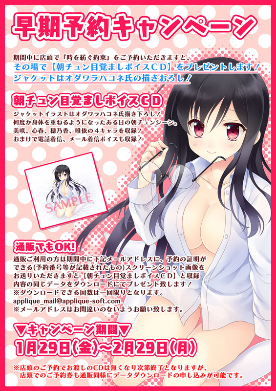 時を紡ぐ約束 プレミアム初回限定版 Getchuで見る ブランド:あっぷりけ(過去の作品一覧) メディア:DVD-ROM 発売日:2016-03-25 定価:¥ 9,800(税込¥ 10,780) ジャンル:絆を育む純愛ADV 原画: オダワラハコネ、師走ほりお シナリオ: 憲yuki、しまとら 音楽:鷹石しのぶ アーティスト:霜月はるか 作詞/作曲:西坂恭平 関連リンク Getchu.com:あらすじ、キャラクターを見る プレミアム初回限定版特典 ラフアートブック、オリジナルサウンドトラック(2枚組)、鷹石しのぶ ピアノアレンジアルバム(楽譜付き) キャンペーン詳細は公式HPでご確認ください 早期予約キャンペーン 朝チュン目覚ましボイスCD 2016-01-29 ~ 2016-02-29 イベント詳細(特に実施店舗)は公式HPでご確認ください バレンタインイベント バレンタインチョコ 2016-02-14 ~ 2016-02-14 バレンタインイベント バレンタインチョコ 2016-02-14 ~ 2016-02-14 予約者対象配布会 特製クリアファイル 2016-02-26 ~ 発売記念抽選会 抽選会 2016-03-25 ~ 2016-03-25 特典紹介画像URLについて 描き下ろし特典 投票数:66 駿河屋 ① 描き下ろしテレカ ・ 2016-02-19 更新 © あっぷりけ 投票数:59 Getchu.com ① 描き下ろしB2タペストリー ・ 2016-02-16 更新 © あっぷりけ 投票数:41 グッドウィル ① 描き下ろしB2タペストリー ・ 2016-02-24 更新 © あっぷりけ 投票数:39 ソフマップ ① 描き下ろしB2タペストリー② 描き下ろしB5下敷き ・ 2016-02-19 更新 © あっぷりけ 投票数:34 ヨドバシカメラ ① 描き下ろしテレカ ・ 2016-02-24 更新 © あっぷりけ 投票数:11 メディオ ① 描き下ろしB2タペストリー ・ 2016-02-19 更新 © あっぷりけ 投票数:3 とらのあな ① 描き下ろし複製イラスト色紙 ・ 2016-02-15 更新 © あっぷりけ 投票数:3 トレーダー ① 描き下ろしB2タペストリー ・ 2016-02-19 更新 © あっぷりけ 投票数:2 メロンブックス ① 描き下ろしB2タペストリー ・ 2016-02-15 更新 © あっぷりけ オリジナル特典 投票数:26 パソコンショップMK ① オリジナルテレカ ・ 2016-02-26 更新 © あっぷりけ 投票数:15 VISCO ① オリジナルテレカ ・ 2016-02-26 更新 © あっぷりけ 投票数:5 よろずやショップびっく宝島 ① オリジナルテレカ ・ 2016-02-26 更新 © あっぷりけ 投票数:3 コムロード ① オリジナルテレカ ・ 2016-02-26 更新 © あっぷりけ 投票数:2 おた★CHU.com ① オリジナルテレカ ・ 2016-02-26 更新 © あっぷりけ 投票数:1 プロップ通販 ① オリジナルテレカ ・ 2016-02-26 更新 © あっぷりけ 投票数:1 ソフピット ① オリジナルテレカ ① ショップと画像が違う 2016-03-07 更新 © あっぷりけ 投票数:1 あみあみ ① オリジナルテレカ ・ 2016-02-26 更新 © あっぷりけ 投票数:0 アリスNET ① オリジナルテレカ ・ 2016-03-03 更新 © あっぷりけ 投票数:0 ファミーズ ① オリジナルテレカ ・ 2016-02-26 更新 © あっぷりけ 投票数:0 古川電気 ① オリジナルテレカ ・ 2016-03-02 更新 © あっぷりけ 投票数:0 Amazon.co.jp ① オリジナルファンシーペーパー ・ 2016-02-26 更新 © あっぷりけ << Prev Next >> DLタイトルPowered by FANZA Webサービス 黄昏のシンセミア【萌えゲーアワード2010 大賞金賞・ユーザー支持賞・キャラクターデザイン賞金賞 受賞】DL価格:¥ 7,124 月影のシミュラクル −解放の羽−【萌えゲーアワード2017 話題賞 受賞】DL価格:¥ 4,889 花の野に咲くうたかたの【萌えゲーアワード2015 主題歌賞 受賞】DL価格:¥ 7,124 Re:birth colony −Lost azurite−DL価格:¥ 7,124 時を紡ぐ約束DL価格:¥ 7,124 コンチェルトノートDL価格:¥ 7,124 黄昏の先にのぼる明日 −あっぷりけFanDisc−DL価格:¥ 6,076 クロスコンチェルト【萌えゲーアワード2019 イノベーション賞 受賞】DL価格:¥ 10,780