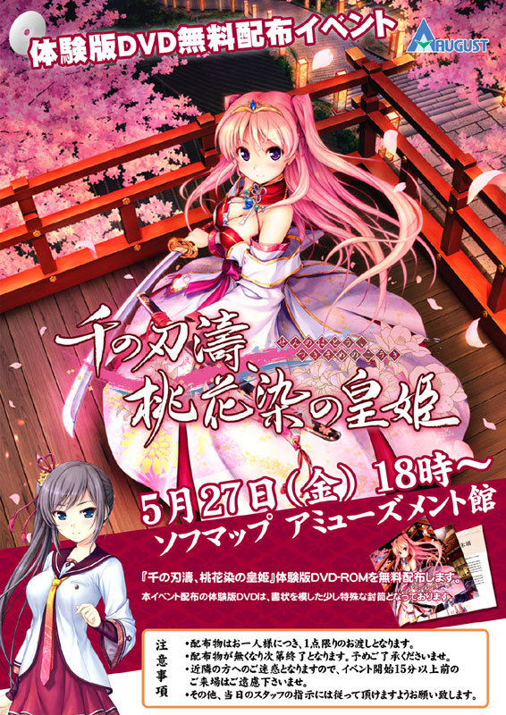 千の刃濤、桃花染の皇姫 プレミアムパック FANZAで見る ブランド:オーガスト(過去の作品一覧) メディア:DVD-ROM+DLカード 発売日:2016-09-23 定価:¥ 13,800(税込¥ 15,180) ジャンル:忠義と愛のADV 原画: べっかんこう、夏野イオ シナリオ: 榊原拓、内田ヒロユキ、安西秀明 音楽:ActivePlanets アーティスト: 作詞/作曲: 関連リンク Getchu.com:あらすじ、キャラクターを見る プレミアムパック特典 特厚設定資料集本「千桃年代記」、イベントCG原画集、録り下ろしドラマCD、描き下ろし抱き枕(宮国朱璃)、大型鈴つき木製絵馬 キャンペーン詳細は公式HPでご確認ください ソフマップ限定早期予約キャンペーン A4クリアファイル ~ イベント詳細(特に実施店舗)は公式HPでご確認ください 体験版無料配布イベント 体験版 2016-05-27 ~ 2016-05-27 七夕イベント「朱璃に願いを」 もしかしたら、願いが叶うかも・・・・・・ 2016-06-24 ~ 2016-06-24 予約引き換えイベント 千桃特製おみくじ 全8種の中からランダムで1種 2016-08-26 ~ 2016-08-26 発売記念イベント 抽選会 2016-09-23 ~ 2016-09-23 特典紹介画像URLについて 描き下ろし特典 投票数:391 Getchu.com ① 描き下ろし抱き枕カバー ・ 2016-07-15 更新 © AUGUST 投票数:342 ソフマップ ① 描き下ろし抱き枕カバー② 描き下ろし色紙③ オリジナルA5マウスパッド ・ 2016-09-06 更新 © AUGUST 投票数:311 トレーダー ① 描き下ろし等身大タ ペストリー ・ 2016-07-15 更新 © AUGUST 投票数:95 ゲーマーズ ① 描き下ろしB2タペストリー② オリジナル特典企画中 ・ 2016-07-15 更新 © AUGUST 投票数:84 メロンブックス ① 描き下ろしB2タペストリー ・ 2016-07-15 更新 © AUGUST オリジナル特典 投票数:61 アリスNET ① オリジナルテレカ ・ 2016-06-01 更新 © AUGUST 投票数:54 ソフピット ① オリジナルテレカ ・ 2016-06-01 更新 © AUGUST 投票数:53 おた★CHU.com ① オリジナルテレカ ・ 2016-06-01 更新 © AUGUST 投票数:52 ファミーズ ① オリジナルテレカ ・ 2016-06-01 更新 © AUGUST 投票数:51 コムロード ① オリジナルテレカ ・ 2016-06-01 更新 © AUGUST 投票数:50 シーガル ① オリジナルテレカ ・ 2016-05-25 更新 © AUGUST 投票数:49 よろずやショップびっく宝島 ① オリジナルA3布ポスター ・ 2016-06-01 更新 © AUGUST 投票数:45 VISCO ① オリジナルテレカ ・ 2016-06-01 更新 © AUGUST 投票数:29 ジーストア ① オリジナルクリーナークロス ・ 2016-05-27 更新 © AUGUST 投票数:17 グッドウィル ① オリジナルB2タペストリー ・ 2016-06-01 更新 © AUGUST 投票数:15 プロップ通販 ① オリジナルテレカ ・ 2016-06-17 更新 © AUGUST 投票数:12 あみあみ ① オリジナルテレカ ・ 2016-06-01 更新 © AUGUST 投票数:10 パソコンショップMK ① オリジナルテレカ ・ 2016-06-01 更新 © AUGUST 投票数:7 中京マイコン ① オリジナルテレカ ・ 2016-06-17 更新 © AUGUST 投票数:6 Amazon.co.jp ① オリジナルA5マウスパッド ・ 2016-06-01 更新 © AUGUST 投票数:6 ブックメイト ① オリジナルテレカ ・ 2016-06-01 更新 © AUGUST 投票数:4 とらのあな ① オリジナルアクリルスマホスタンド ・ 2016-05-24 更新 © AUGUST 投票数:4 ラムタラ ① オリジナル図書カード ① 初回限定版特典 2016-06-01 更新 © AUGUST 投票数:3 古川電気 ① オリジナルテレカ ・ 2016-06-01 更新 © AUGUST 投票数:2 アニメイト ① オリジナルB2タペストリー ・ 2016-07-23 更新 © AUGUST << Prev Next >> DLタイトルPowered by FANZA Webサービス 穢翼のユースティア 〜新装版〜DL価格:¥ 8,580 千の刃濤、桃花染の皇姫【萌えゲーアワード2016 グラフィック賞 受賞】DL価格:¥ 8,580 千の刃濤、桃花染の皇姫‐花あかり‐【萌えゲーアワード2019 ファンディスク賞 受賞】DL価格:¥ 7,480 夜明け前より瑠璃色な【Windows10対応版】DL価格:¥ 7,480 夜明け前より瑠璃色な Moonlight Cradle【Windows10対応版】DL価格:¥ 6,490 大図書館の羊飼い 放課後しっぽデイズ【全年齢向け】DL価格:¥ 1,320 【無料】千の刃濤、桃花染の皇姫 PC版 体験版DL価格:¥ 0 【音楽】Iris Summer Style(あいりすミスティリア!マリンフェステーマ)DL価格:¥ 700 【音楽】『あいりすミスティリア!〜少女のつむぐ夢の秘跡〜』ORIGINAL SOUND TRACK VOL.8DL価格:¥ 2,970 【音楽】Summer Sign/Twinkle Girl’sDL価格:¥ 1,500
