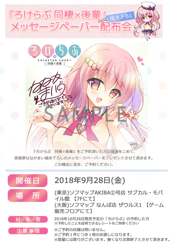 ろけらぶ -Location Love- 同棲×後輩 通常版 FANZAで見る ブランド:フロントウイング(過去の作品一覧) メディア:DLカード 発売日:2018-10-26 定価:¥ 1,980(税込¥ 2,178) ジャンル: 原画: ななかまい シナリオ: 保住圭 音楽: アーティスト: 作詞/作曲: 関連リンク Getchu.com:あらすじ、キャラクターを見る キャンペーン詳細は公式HPでご確認ください 予約キャンペーン 描き下ろし複製色紙 特装版キャンペーン 2018-06-29 ~ イベント詳細(特に実施店舗)は公式HPでご確認ください ご予約者対象イベント 描き下ろしメッセージペーパー 2018-08-31 ~ 2018-08-31 ご予約者対象イベント 描き下ろしメッセージペーパー 2018-09-28 ~ 2018-09-28 無料配布イベント ラブレター 2018-09-28 ~ 2018-09-28 ご購入者対象イベント 特製ミニ色紙 2018-10-26 ~ 2018-10-26 特典紹介画像URLについて オリジナル特典 投票数:100 Getchu.com ① オリジナルB2タペストリー ① 特装版特典 2018-10-04 更新 © Frontwing 投票数:100 ソフマップ ① オリジナルB2タペストリー ① 特装版特典 2018-09-28 更新 © Frontwing 投票数:1 トレーダー ① オリジナルアクリルキーホルダー ・ 2018-09-27 更新 © Frontwing << Prev Next >> 専売グッズ紹介画像URLについて ¥3,850 Getchu.com ① 限定タペストリー ・ 2018-09-12 更新 © © Frontwing ¥3,850 ソフマップ ① 限定タペストリー ・ 2018-09-12 更新 © © Frontwing ¥3,850 トレーダー ① 限定タペストリー ・ 2018-09-12 更新 © © Frontwing ¥3,850 複数店舗 ① 共通タペストリー ① 特装版に同梱されているものと同じ絵柄 2018-09-12 更新 © © Frontwing DLタイトルPowered by FANZA Webサービス グリザイアの迷宮【萌えゲーアワード2012 大賞銀賞 受賞】DL価格:¥ 7,124 グリザイアの果実【萌えゲーアワード2011 大賞金賞 受賞】DL価格:¥ 7,124 グリザイアの楽園 −LE EDEN DE LA GRISAIA−【萌えゲーアワード2013 準大賞 受賞】DL価格:¥ 7,124 花束を君に贈ろう‐Kinsenka‐【全年齢向け】DL価格:¥ 4,950 グリザイア:ファントムトリガーVol.1〜8セット【全年齢向け】DL価格:¥ 25,102 GINKA【全年齢向け】DL価格:¥ 3,278 【全年齢】グリザイア クロノスリベリオンDL価格:¥ 10,780 【全年齢】グリザイア ファントムトリガーVol.8DL価格:¥ 5,478 【全年齢】グリザイア ファントムトリガーVol.7DL価格:¥ 4,378 【全年齢】グリザイア ファントムトリガーVol.5.5DL価格:¥ 2,178