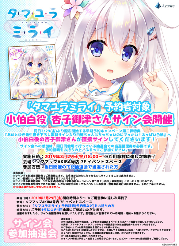 タマユラミライ FANZAで見る ブランド:Azurite(過去の作品一覧) メディア:DVD-ROM 発売日:2019-05-31 定価:¥ 9,800(税込¥ 10,780) ジャンル:ヒトと妖異と魔法使いが織りなすミステリアスADV 原画: 茉宮祈芹、あめとゆき、柚木ガオ(SD原画) シナリオ: 籐太、にっし~ 音楽: アーティスト: 作詞/作曲: 関連リンク Getchu.com:あらすじ、キャラクターを見る キャンペーン詳細は公式HPでご確認ください 早期予約キャンペーン 描き下ろし複製サイン入り神掛由岐奈の照れる仕草がツンデレカワイイおっぱい色紙 2019-01-25 ~ 早期予約キャンペーン第2弾 描き下ろし複製サイン入り白姉ちゃんはちっちゃいのにでっかい!おっぱい色紙 2019-03-29 ~ イベント詳細(特に実施店舗)は公式HPでご確認ください 4タイトル合同キャンペーン スティックポスター4枚セット 2019-01-25 ~ 2019-01-25 ご予約者対象サイン会イベント サイン会 2019-03-29 ~ 2019-03-29 DiGination3ブランド合同キャンペーン オリジナル特製ボックスティッシュ 3タイトルのうち2タイトルを予約 2019-04-26 ~ 2019-04-26 DiGination3ブランド合同キャンペーン オリジナル特製ボックスティッシュ 3タイトルのうち2タイトルを予約or購入 2019-05-31 ~ 2019-05-31 無料配布イベント プレビューブック 2019-04-26 ~ 2019-04-26 特典紹介画像URLについて 描き下ろし特典 投票数:330 Getchu.com ① 描き下ろしB2タペストリー② ボイスドラマDLCカード ② 深野町パジャマパーティー 2019-01-21 更新 © DMMGAMES 投票数:162 ソフマップ ① 描き下ろしB2タペストリー② ボイスドラマDLCカード③ アクリルキーホルダー ② みんなおいでよ、タマユラ温泉 2019-05-13 更新 © DMMGAMES 投票数:110 駿河屋 ① 描き下ろしB2タペストリー② ボイスドラマDLCカード ② 白と花子のメイドさんのいる喫茶店 2019-01-26 更新 © DMMGAMES 投票数:58 FANZA ① 描き下ろしB2タペストリー ・ 2019-01-25 更新 © DMMGAMES 投票数:55 トレーダー ① 描き下ろしB2タペストリー② ボイスドラマDLCカード ② 深野ドーナツ怪奇事件 2019-01-26 更新 © DMMGAMES 投票数:30 メロンブックス ① 描き下ろしB2タペストリー② ボイスドラマDLCカード ② 深野町納涼花火大会 2019-01-26 更新 © DMMGAMES 投票数:14 Amazon.co.jp ① ボイスドラマDLCカード ① 由岐奈とみだりと森のティータイム 2019-01-26 更新 © DMMGAMES オリジナル特典 投票数:22 シーガル ① オリジナルテレカ ・ 2019-03-26 更新 © DMMGAMES 投票数:22 とらのあな ① オリジナルA3お風呂ポスター ・ 2019-03-27 更新 © DMMGAMES 投票数:22 パソコンショップMK ① オリジナルテレカ ・ 2019-03-26 更新 © DMMGAMES 投票数:22 ブックメイト ① オリジナルテレカ ・ 2019-03-27 更新 © DMMGAMES 投票数:18 いまじん ① オリジナル大型布ポスター ・ 2019-03-27 更新 © DMMGAMES 投票数:8 よろずやショップびっく宝島 ① オリジナルテレカ ・ 2019-03-27 更新 © DMMGAMES 投票数:6 中京マイコン ① オリジナルテレカ ・ 2019-03-27 更新 © DMMGAMES 投票数:5 古川電気 ① オリジナルテレカ ・ 2019-03-25 更新 © DMMGAMES 投票数:1 アリスNET ① オリジナルテレカ ・ 2019-03-25 更新 © DMMGAMES 投票数:1 ゲーマーズ ① オリジナルB5MFタオル ・ 2019-03-26 更新 © DMMGAMES 投票数:1 南海BOOKS2号店 ① オリジナルテレカ ・ 2019-03-26 更新 © DMMGAMES 投票数:0 プロップ通販 ① オリジナルテレカ ・ 2019-03-26 更新 © DMMGAMES 投票数:0 あみあみ ① オリジナルテレカ ・ 2019-03-27 更新 © DMMGAMES << Prev Next >> DLタイトルPowered by FANZA Webサービス タマユラミライ【萌えゲーアワード2019 準大賞・ユーザー支持賞 受賞】DL価格:¥ 7,945 シンソウノイズ 〜受信探偵の事件簿〜【萌えゲーアワード2016 ゲームデザイン賞 受賞】DL価格:¥ 8,963 あくまで、これは〜の物語DL価格:¥ 8,963 【期間限定】Azuriteブランド+ASMRセットDL価格:¥ 6,839 【バイノーラル録音】タマユラミライ バイノーラルボイスドラマCD 水晶石みだり編【ASMR】DL価格:¥ 980 【バイノーラル録音】タマユラミライ バイノーラルボイスドラマCD 神掛由岐奈編【ASMR】DL価格:¥ 980 【バイノーラル録音】タマユラミライ バイノーラルボイスドラマCD 小伯白編【ASMR】DL価格:¥ 980 【バイノーラル録音】タマユラミライ バイノーラルボイスドラマCD 猫天宮花子編【ASMR】DL価格:¥ 980
